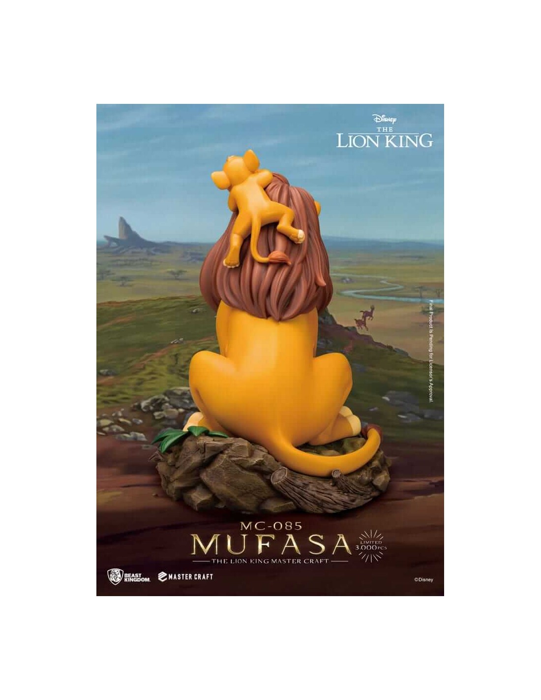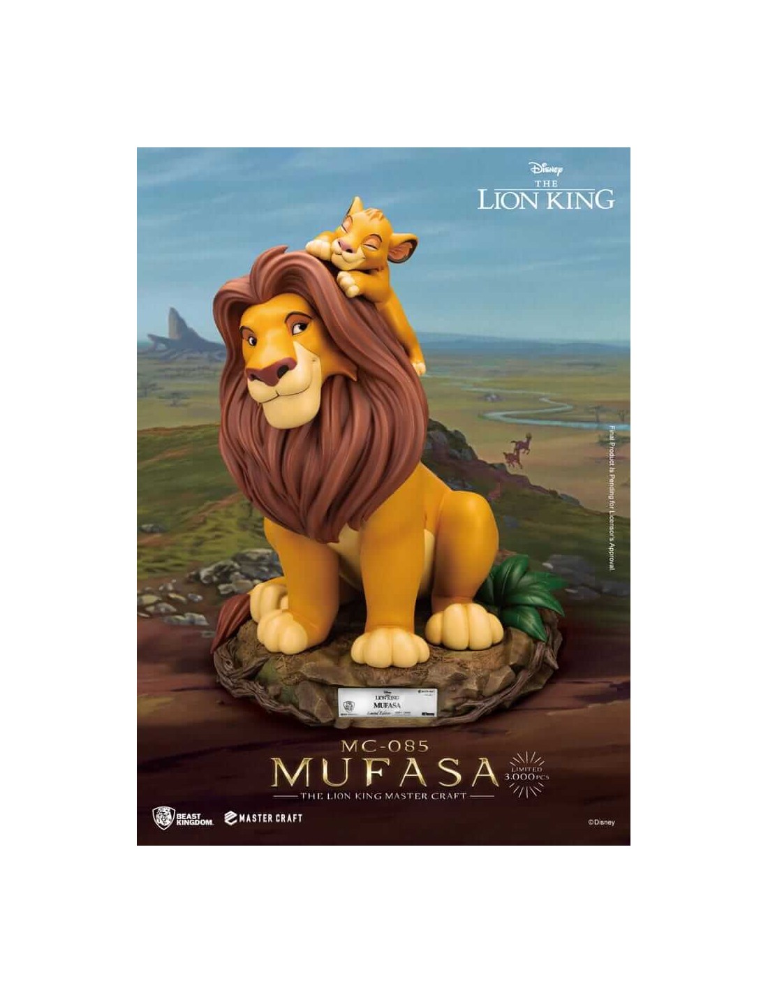 Beast Kingdom has once again showcased its exceptional Master-Craft series and attention to detail, faithfully recreating the unforgettable father-son bond from Disney's classic animated film, The Lion King. The statue captures the iconic image of Mufasa and Simba, bringing to life their majestic and warm connection. This masterpiece is not only a treasure for Disney fans but also a must-have collectible for all who appreciate fine artistry.Mufasa's regal and gentle expression, along with Simba's trusting and playful pose, are brilliantly captured, making it feel as though a heartwarming and emotional story is unfolding right before your eyes. Every detail reflects Beast Kingdom's deep understanding and respect for the original animation, from the texture of Mufasa's mane to Simba's innocent smile, where you can experience the passing of life and the power of love shared between father and son. Product Size: 36 cm