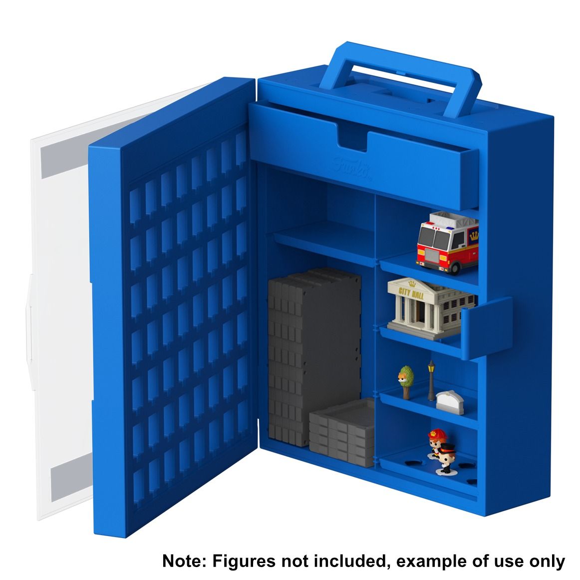 The front of this case features a clear viewing window and 56 slots for Bitty POP! collectibles. Open the case to find the storage compartment within, which includes 4 removable shelves and 1 drawer—perfect for storing Bitty City Tiles, Bitty POP! Towns, Bitty POP! Rides, Pin Risers, Pin Props, Bitty POP! figures, and more!