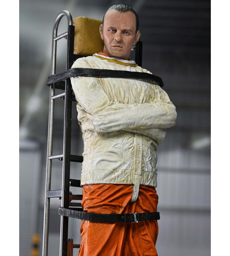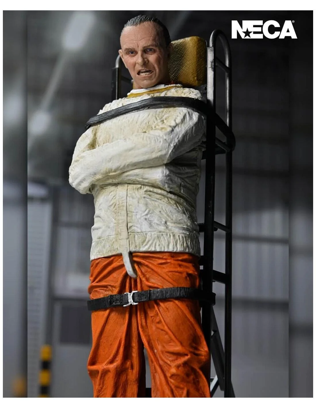 Add the iconic Hannibal Lecter to your horror collection! Portrayed by Oscar winner Anthony Hopkins, the brilliant and psychotic doctor from The Silence of the Lambs stands in his orange prison uniform and straight jacket. This chilling 7" scale figure by NECA is articulated for posing and comes with interchangeable heads, his trademark mask, and a dolly accessory for transporting him. Ages 18+.