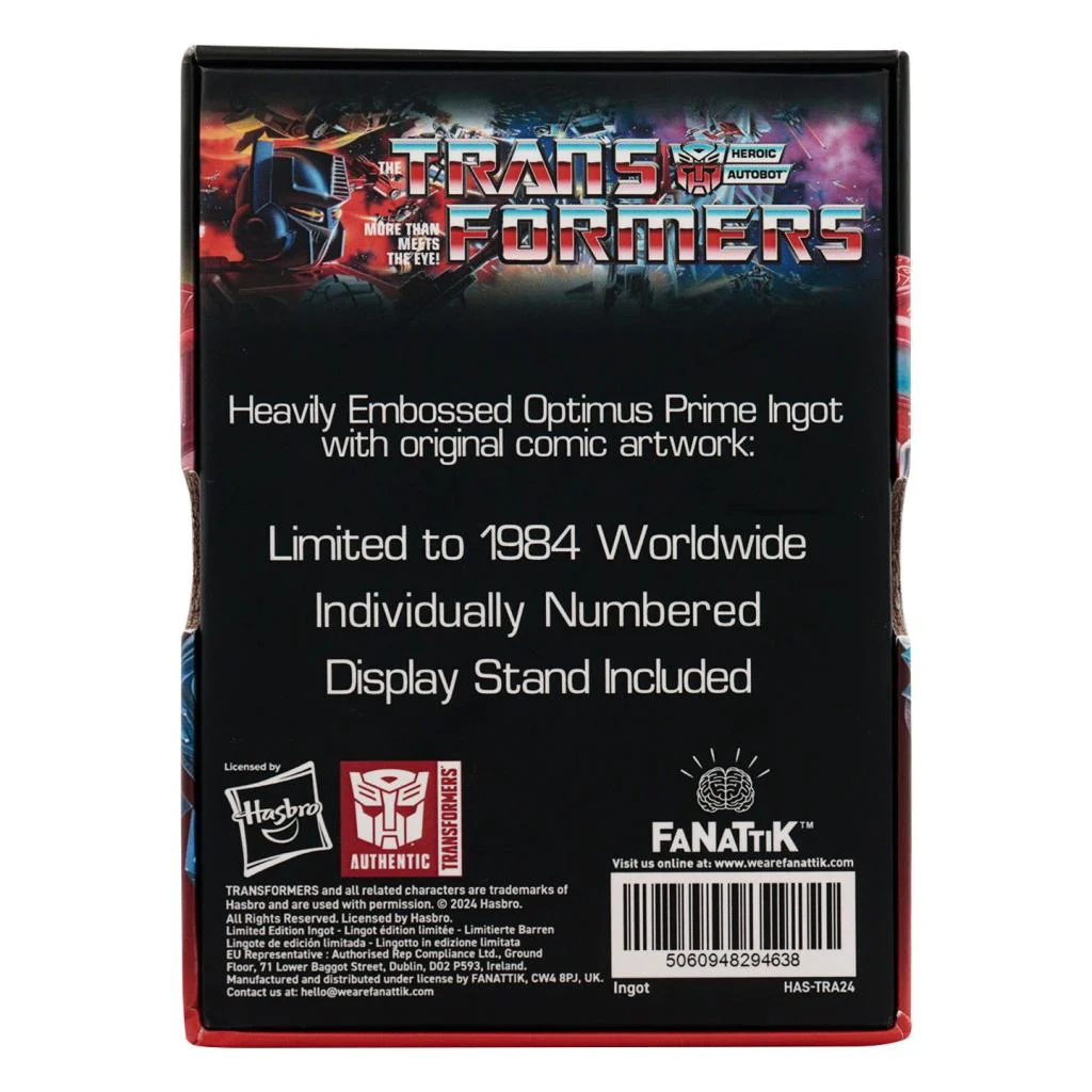 Featuring artwork from the original Transformers comic run, this limited edition metal ingot showcases the heroic leader of the Autobots, Optimus Prime, in heavily embossed coloured enamel. Individually numbered to the reverse, each ingot is one of 1,984 worldwide, signifying the year we were introduced to the Transformers, and comes in a presentation box with display stand.